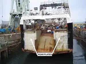 ![]() Wear plates fitted over stern of Alaska Ranger, shown in 2005. Stern ramp in the center allowed nets to be launched into the sea and then hauled on board with their catch. | |