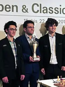 In January, at the 74th Tata Steel Chess Tournament A in Wijk aan Zee (previously known as Corus Chess), he finished on place second together with Magnus Carlsen and Teimour Radjabov, behind the winner Levon Aronian.[16] In March at the 27th Reykjavik Open in Reykjavík, Iceland, he finished first with 7½/9.[17] In May he won the 20th Sigeman & Co Chess Tournament, an eight-player round-robin tournament, in Malmö, Sweden, with 5½/7, half point ahead of Peter Leko.[18] June saw him at the 7th Tal Memorial where he finished second with a score of 5½/9 after tiebreak with Teimour Radjabov behind Magnus Carlsen.[19] By July, at the 40th Dortmund Sparkassen Chess Meeting, he was victorious once again with a score of 6/9 after tiebreak with Sergey Karjakin.[20] In the fall, in the period from September–October, he played in the Grand Slam Chess Final in São Paulo and Bilbao, Caruana won 4 games, drew 5 and lost 1, tying for 1st with Magnus Carlsen, but eventually losing both blitz tiebreak games and thus ending 2nd.[21] In November at the 6th Kings Tournament, organized in Bucharest by the Romanian capital chess club, Caruana tied all the games to get third in a shortlist, yet strong tournament (average Elo 2747) behind Vasyl Ivanchuk, winner, and Veselin Topalov, runner-up.[22]