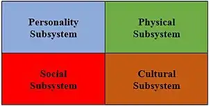 The Systemic Quality of Life (SQOL) has been defined as the effective functioning of human individuals in four functioning subsystems: the cultural, the social, the physical and the personality subsystems.[21] The axiomatic foundations of SQOL suggest the regional hypothesis that the four subsystems should be empirically validated (i.e., item of each would occupy a distinct region) and that they be mutually oriented in space in a specific 2x2 pattern topologically equivalent to the 2x2 classification shown in Figure 2 (i.e., personality opposite cultural, and physical opposite social). The hypothesis has been confirmed by many studies.