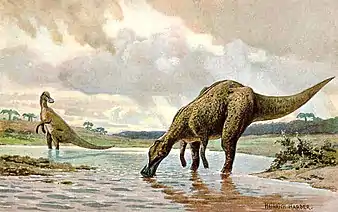 Bipedalism was common in all major groups of dinosaurs.[1] Phylogenetic studies indicate that bipedalism in dinosaurs arose from one common ancestor, while quadrupedalism arose in multiple lines, coinciding with an increase in body size.[1] To understand how bipedalism arose in dinosaurs, scientists studied extant facultatively bipedal lizards, especially of the clade squamata.[1] The proposed explanation for the evolution of bipedalism in dinosaurs is that it arose in smaller carnivores that were competing with larger carnivores. The need for speed and agility prompted the adaptation of a larger hind-limb muscle, which in turn prompted the shift to facultative bipedalism, where the weaker front legs would not slow them down. Facultatively bipedal dinosaurs encountered ecological pressures for longer periods of high speed and agility, and so longer periods of bipedalism, until eventually they became continually bipedal. This explanation implies that facultative bipedalism leads to obligate bipedalism.[1]