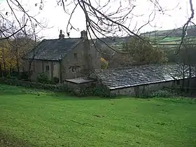 The outbuildings are detached from the main house and run at right angles to it on its western side. They are approximately 12 metres in length and slope down to the valley of the Dale Dike, so much so that the downhill end of the building has two storeys while the uphill end has only one. The building materials are the same as the main house, being gritstone blocks and stone slate and the mainstay of the building is believed to be 17th century. However, there have been some changes to the original design with a large boarded double door being added and resulting changes to the stonework to make a garage. There have also been some modifications to some of the other openings.[4]