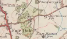 Ordnance Survey mapping from 1919 shows Fair Oak Park House situated where the junction of Mimosa Drive and Glenwood Court is today. The driveway from the house ran northeastwards, parallel to Mortimers Lane, before turning at a right angle and joining Mortimers Lane directly opposite Knowle Lane.[1]