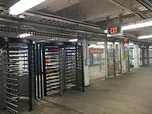 Fairmount is a subway station in the Francisville section of North Philadelphia, Pennsylvania. It is served by SEPTA's Broad Street Line (as a local stop) and the Broad-Ridge Spur. There are three separate platforms. The Broad-Ridge Spur and Broad Street Line (BSL) northbound platforms connect inside the faregates, but the BSL's southbound platform cannot be reached from the other two without exiting. Such a connection once existed; the sealed-off entrance can be seen at platform level heading south towards the end of the platform. Travelers wishing to switch between the Broad-Ridge Spur and the southbound BSL must connect at Girard. The Broad-Ridge Spur platform is shortened and can only accommodate short 2-car trains; the unused part of the platform is visible from passing trains and is covered in layers of graffiti. Fairmount station on the Broad-Ridge Spur has a full mezzanine concourse extending from Wallace Street to Ridge Avenue, now abandoned.