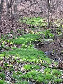 Like the nearby Walden Pond (about half a mile to the south), Fairyland lies within a kettle hole, a depression formed by a retreating glacier. The artificial pond itself covers an area of 2.75 acres. Unlike Walden Pond (which is the deepest lake in Massachusetts), the Fairyland Pond is relatively shallow, with a maximum depth of 4 feet. Its 60-acre watershed is largely undeveloped, lying mostly within the Hapgood Wright conservation area. A certified vernal pool[6] lies immediately to the west of the pond. The surrounding forest is primarily mixed hardwood, hemlock, pine and maple, and the area provides habitat for a diverse range of wildlife.[7]