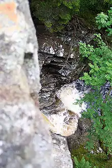 The falls were probably formed some time in the last 10,000 years, after the retreat of the glaciers at the end of the last ice age. The waters slowly cut through the rock which had been pushed up by the geological forces which formed the Scottish Highlands some 500 million years ago. The layering of the rocks means that the water has cut a meandering path through the softer rock and left the harder rock untouched. This has led to the creation of deep pools, outcrops and, in one place, a natural arch. The falls consist of two large falls and a number of smaller drops. The water is often coloured brown from the peat through which it flows.