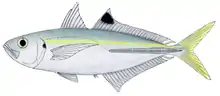 The false scad is a moderately large species, growing to a known maximum length of 60 cm and a weight of 1 kg,[7] although is more common at lengths of around 35 cm. The species has a much different body profile to most other species of Caranx, possessing an elongate, slightly compressed body in place of the deep, oblong shaped forms of its larger relatives. The species dorsal profile is approximately as equally convex as the ventral profile.[10] The dorsal fin is in two distinct parts, the first consisting of 8 spines while the second has 1 spine and 28 to 32 soft rays. The anal fin consists of 2 detached spines anteriorly, followed by 1 spine and 25 to 28 soft rays. The soft rays located at the end of both the dorsal and anal fins are detached and only connected by a basal interradial membrane, forming a partially detached finlet. The pectoral and pelvic fins are both short.[10] The species lateral line is weakly arched anteriorly, becoming straight after the end of the dorsal fin lobe. The curved section has 45 to 55 scales present and 0 to 3 scutes, while the straight section contains 0 to 8 scales and 24 to 32 scutes. The shoulder girdle is smooth, lacking papillae.[10] The false scad has a well-developed adipose eyelid, particularly posteriorly, with both the jaws containing irregular narrow bands of fine teeth.[11] The species has 50 to 58 gill rakers and 24 vertebrae.[10]