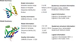 Fam158a has an isoelectric point of 5.5[19] and a molecular weight of 23 kiloDaltons.[20] Fam158a does not have any predicted signal peptides or transmembrane regions. There are several predicted phosphorylation sites.[21][22] marked in the conceptual translation as well as the predicted secondary structure.[23] There are no regions significantly different from other human proteins with regard to composition, regions of polarity, or regions of hydrophobicity. iPsortII predicts no signal peptides and localizes Fam158a to the cytoplasm-[24] I-Tasser[25] predicts several structures for Fam158a and the best prediction is shown. Swiss Model[26] predicts two potential protein structures, as seen in the images. The first structure predicts the protein forms a protein dimer, the second as a monomer. Rual et al.[27] found that Fam158a interacts with a protein called TTC35. The function of TTC35 is unknown but it is also known to interact with Cox4NB and Ubiquitin C.