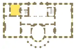 During the presidential administration of Thomas Jefferson, the Common Dining Room rather than the Public Dining Room was used primarily for family meals.[7] At Jefferson's request, Latrobe drafted plans for altering the State Floor. In 1807, he proposed turning the Porter's Lodge into a sitting room, and partitioning the Public Dining Room. The eastern part of the room would contain a toilet and dressing room, while the western two-thirds of the room would become a bedroom.[2] Latrobe envisioned this as private space for the president to use during the day, or as quarters for a high-ranking presidential aide. Latrobe's changes, however, were never implemented.[4][lower-alpha 2][8]