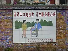 ![]() A government sign in Tangshan Village, De'an County, Jiujiang, Jiangxi: "For the sake of the country's prosperity and families' happiness, please implement family planning" | |||||||||