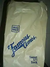 The 1980s packages consisted of small plastic bags that resembled the larger bags of the same material used by supermarkets during that period. They had the brand's name inscribed in small letters, and once again, with a photo of Amos apparently spinning a large chocolate chip cookie on his finger, in a way that was similar to the basketball-spinning trick made famous by the Harlem Globetrotters.