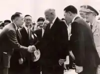 In 1947, Fang was elected to the political council of the Kuomintang.[47] In September 1947, the Nationalist government attempted a ban on commercial dance halls as an austerity measure to be implemented due to the ongoing civil war.[48] In response to the unpopular decision, which was implemented slowly and reluctantly by the Shanghai government, 200,000 taxi dancers took to the streets and riots ensued.[49] Fang's propaganda machine attempted to ease the situation with statements saying that dancing girls should be redirecting their talents to reconstructing the country and eliminating the Communist bandits. A Time magazine article quoted Fang attempts in this regards: "I think no patriotic man or woman wants to embrace each other under soft lights ... Dancing girls could be trained to acquire useful talents in reconstructing the country and wiping out bandits".[50]