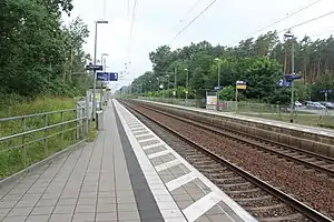 Fangschleuse railway station is a railway station serving Grünheide (Mark) and Freienbrink, in the State of Brandenburg, Germany. The station is located on the Berlin–Wrocław railway (now servicing Frankfurt (Oder) station to Warsaw, not Wrocław). The train services are operated by Deutsche Bahn.