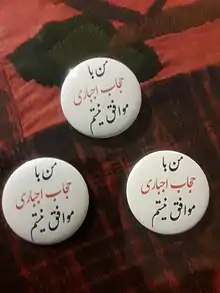 Meysami was arrested at his personal library and transferred to ward 209 of Evin prison in Tehran.[5] He went on a hunger strike on August 1 to protest against "unjustified accusations, the illegal procedure following his detention, and denial of his right to access an independent lawyer".[6][7] He was not able to publicly announce his hunger strike before the 19th day of his strike, as he was being held in solitary confinement until that day.[7] The allegation brought against Meysami is acting against the national security,[8] a rather common accusation against political and civil rights activists in Iran. Apparently, Meysami's support for the “Girls of Enghelab Street”—a series of protests against compulsory hijab in Iran— is being used to corroborate the charges against him. To provide the material evidence for the accusation the security forces have confiscated pin-back buttons from his library in Tehran. The pin-back buttons have “I do not agree with compulsory hijab” marked on them in Persian.[8][5][7][9][10]