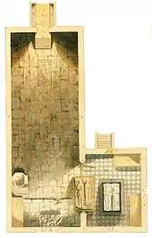 Antiquarian curiosity in the castle had begun as early as 1700, when Peter Le Neve visited and recorded some of the architectural details, but interest increased in the 19th century.[59] This was partially due to the work of the local curate, the Reverend J. Jackson, who undertook the first archaeological excavations at the site during the 1840s, uncovering many of the foundations of the inner court.[60] 17th and 18th century stained glass windows from the continent were installed in the chapel, where the 15th century wall paintings were rediscovered in 1844.[61] The then owner, Colonel John Houlton, turned the chapel into a museum of curiosities, where for a small fee visitors could see sets of armour, what was said to be a pair of Oliver Cromwell's boots and other English Civil War artefacts, including letters from Cromwell written to the Hungerfords.[62]
