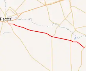 FM 1450 begins at US 285 approximately 3.0 miles (4.8 km) southeast of Pecos[1] in Reeves County, and the two-lane road proceeds to the southeast.[2] After crossing into Pecos County, FM 1776 joins the road from the south and briefly runs concurrently with FM 1450 before FM 1776 turns off to the north.[3] The road continues to the southeast and crosses SH 18. RM 2593 turns off the road to the north before the route ends at FM 1053. The roadway continues to the southeast as a county road.[4] FM 1450 passes through agricultural land and encounters no cities or towns.[2][3][4]