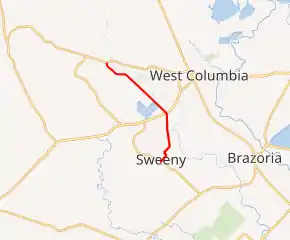 FM 1459 begins at a blinking light, at the intersection of FM 524 in the heart of Sweeny.[2] Traveling along Second Street, the highway makes two 90 degree curves: one to the northwest, passing Sweeny Community Hospital, then to the northeast, leaving town in a northerly direction. It crosses FM 522 and then SH 35 to the southwest of West Columbia.[3] FM 1459 turns to the northwest, passing small communities such as Camp Karankawa alongside the San Bernard River, to its northern end at FM 1301 near Danciger.[1][4]
