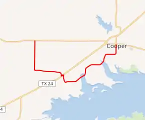 Farm to Market Road 1528 (FM 1528) is a farm-to-market road located in the western and central portions of Delta County in the U.S. state of Texas. The highway is approximately 11.4 miles (18.3 km) in length, and travels through mainly rural portions of Delta County. The roadway begins at an intersection with FM 64 in the community of Antioch. The highway proceeds southward, passing through the former community of Gough, before bending east. The highway proceeds east, running concurrently with State Highway 24 (SH 24) for a short distance. The road travels northeast, parallel to Cooper Lake, before bending north and entering Cooper, where it terminates at SH 154.
