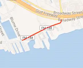FM 188 begins at an intersection with 89th Street / Blume Drive in Galveston, Galveston County, heading east-northeast on two-lane undivided Teichman Road. The road heads through areas of homes and businesses with some wetlands. FM 188 ends at an interchange with I-45, where SH 275 heads to the north.[1][2][3]