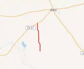 Farm to Market Road 220, or FM 220, in eastern Texas (USA), runs about 4.07 miles (6.55 km) from an intersection with a county road, north to TX 21 southwest of Alto. Prior to 1951, the FM 220 designation belonged to a road in Hamilton County starting with a Minute Order on June 18, 1945. This version of FM 220 originally went from Lanham to Fairy. A November 23, 1948 Minute Order extended the road to Hico from Fairy, for 9.8 miles (15.8 km). Another addition came by Minute Order on July 14, 1949, for 4.7 miles (7.6 km) past Lanham. This FM 220 was cancelled on November 30, 1950 and changed designations to FM 1602 to avoid confusion with TX 220 in Hico.[1][2]