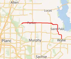 The western terminus of FM 2514 is at the Plano–Parker city line; the continuation into Plano is known appropriately as Parker Road.[2] The route travels east through Parker and Saint Paul before turning southward into Wylie.[3] The route ends at SH 78 in central Wylie.[1]