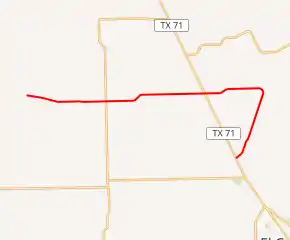 FM 2546 starts at a rural intersection in front of Mount Pilgrim Baptist Church. The paved highway ends at this location. From here, gravel-topped County Road 394 continues west and another gravel road goes north. From the church east to FM 1160 at the site of Hahn is 3.3 miles (5.3 km). The distance from FM 1160 eastward to SH 71 is 4.2 miles (6.8 km). The Hahn Cemetery is on the south side of the road along this stretch of FM 2546. Continuing east of SH 71, the highway passes through the tiny community of Jones Creek. At a distance of 2.3 miles (3.7 km) east of SH 71, FM 2546 turns sharply to the southwest. After going southwest an additional 2.3 miles (3.7 km) the highway comes to the intersection with FM 2765. Continuing to the southwest for 1.0 mile (1.6 km), FM 2546 ends at a stop sign on SH 71. The continuation of the road on the west side of SH 71 is called Sandy Corners Road.[2]