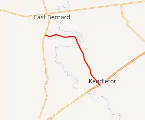 A two-lane road, FM 2919 starts at a stop sign on SH 60 at the southern edge of East Bernard in Wharton County and heads in an easterly direction for about 2.4 miles (3.9 km). After veering to the southeast for another 0.8 miles (1.3 km) the highway crosses the San Bernard River and enters Fort Bend County near the Bay Ridge Christian College. From the river to the tiny community of Powell Point is 1.1 miles (1.8 km). FM 2919 continues to the southeast for another 2.7 miles (4.3 km) to Loop 541 and the Union Pacific Railroad in Kendleton. From Loop 541 to the Future I-69/US 59 feeder road and overpass is a short block.[2]