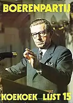 In the elections of 1963 the Farmers' Party won three seats in the House of Representatives. The party had gained considerable attention when the police had forcibly seized farms whose owners had not paid their taxes. Koekoek, the party's leader, came from the same region and acted as spokesperson for these farmers. With its populist appeal the party had been able to get the support from farmers and non-farmers, even from urban areas. He headed the party's list and became the chairperson of the parliamentary party. In 1966 the party won two seats in the Senate.