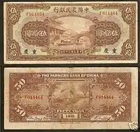 ![]() A 1941 banknote issued by the Farmers Bank of China | |