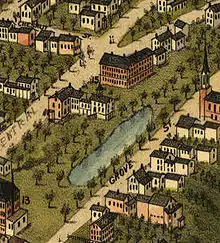 Inhabitants of the Northwest Parish were taxed to support both the meetinghouse and minister on Rochester Hill about 12 miles (19 km) away, a distance which made attendance difficult. A movement began in the 1770s to establish a separate township, and in 1783 a petition for charter was submitted to the state legislature. It was denied, but another petition in 1798 was granted. With about 1,000 inhabitants, Farmington was incorporated.[7] In 1800, a 40-by-50-foot (12 by 15 m), two-story meetinghouse was erected on Meetinghouse Hill. The same year, John Wingate established a blacksmithy. He would also become proprietor of Wingate's Tavern.