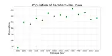 Farnhamville was platted in 1881 under the name Farnham, named in honor of R. E. Farnham, a railroad official.[3] Postal authorities refused to accept the name Farnham, so town was renamed Farnhamville when the post office opened later in 1881.[3][4] Farnhamville was incorporated as a city in 1892.[5]
