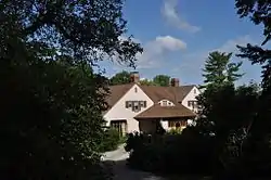 The house was built in 1908 to a design by Taylor, a prominent New York City architect who summered in Norfolk. It is one of three stucco houses designed by Taylor in the years 1906-08 that are set on the west side of Litchfield Road.[3] This house in particular bears a strong resemblance to Moor Crag, a house near Bowness-on-Windermere in Cumbria, England designed in 1898 by the English architect Charles Voysey, but presents its own distinctive interpretation of an English country house of the period.[2]