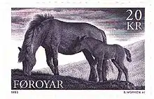 The Faroe pony, Faeroes pony, or Faroese horse,[1] (Føroyska rossið in Faroese) is a small pony, with a height between 11.1 to 12.1 hands (45 to 49 inches, 114 to 124 cm). Technically this animal is a pony due to its height, but in the Faroe Islands it is called a horse because of its strength. The Faroe pony is only to be seen on the Faroe Islands and is therefore little known in other countries. There are only 94 Faroe ponies left living on the Faroe Islands.[2]