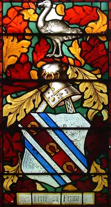 There is an apparent symbiotic relationship between the surname and armorial bearings issued to various houses of Farrar/Farrer/Ferrar, all of which have, on a bend, three horseshoes and some have a horseshoe on the crest. Such as Fairer of Warcorp Tower, Westmoreland[14]: 43 And pedigrees recorded in the Visitation of Surrey[15]: 157–158 and Visitation of Hertford.[16]: 58 The arms of Nicholas Ferrar.[17]