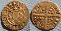 Henry V's single issue of farthings (1413–1422) is distinguishable from those of his father because his effigy shows his neck, but is more difficult to distinguish from those of Henry VI's first reign (1422–1461). Farthings of Henry V and Henry VI were produced in London and Calais (VILLA CALIS), though Henry V Calais farthings are extremely rare.