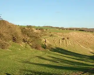Farthing Common is an area of common land about 10 km northwest of Folkestone in East Kent. It is one of the highest points of the North Downs at 185 metres above sea level, and was the junction of the ancient trackway along the Downs from Folkestone, with the Roman road (now the B2068 Stone Street) between Lympne and Canterbury.