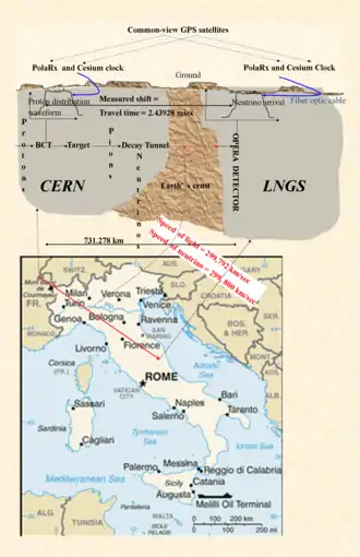 The experiment created a form of neutrinos, muon neutrinos, at CERN's older SPS accelerator, on the Franco–Swiss border, and detected them at the LNGS lab in Gran Sasso, Italy. OPERA researchers used common-view GPS, derived from standard GPS, to measure the times and place coordinates at which the neutrinos were created and detected. As computed, the neutrinos' average time of flight turned out to be less than what light would need to travel the same distance in a vacuum. In a two-week span up to November 6, the OPERA team repeated the measurement with a different way of generating neutrinos, which helped measure travel time of each detected neutrino separately. This eliminated some possible errors related to matching detected neutrinos to their creation time.[10] The OPERA collaboration stated in their initial press release that further scrutiny and independent tests were necessary to definitely confirm or refute the results.[8]