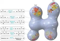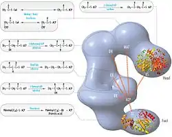 ![]() FAS 'head-to-tail' model with positions of polypeptides, three catalytic domains and their corresponding reactions, visualization by Kosi Gramatikoff. |