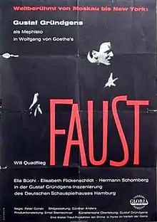 Faust is a 1960 West German theatrical film directed by Peter Gorski. It is based on Goethe's Faust (1808) and adapted from the theater production at the Deutsches Schauspielhaus in Hamburg. It stars Peter Gorski's adoptive father Gustaf Gründgens as Mephistopheles and Will Quadflieg as Faust, and was chosen as West Germany's official submission to the 33rd Academy Awards for Best Foreign Language Film, but did not manage to receive a nomination.[1][2] The film also won a Deutscher Filmpreis (transl.: German Movie Award) for an Outstanding Documentary or Cultural Film in 1961.