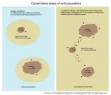 The favourable conservation status of wolves is the definition of a wolf population that is no longer threatened with extinction, that is capable of long-term survival. In Europe the favourable conservation status is defined by the Guidelines for Population Level Management Plans for Large Carnivores. It is the minimum viable population, that can be of different numbers of wolves depending on their connectivity with neighbouring populations. According to the IUCN guidelines, at least 1000 adult animals are required for isolated populations. If a wolf population is effectively linked genetically and demographically with other wolf populations, more than 250 mature wolves may be sufficient.[1]