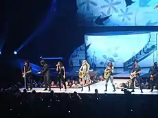 Swift's first televised performance of "Fearless" was on November 10, 2008, on the Late Show with David Letterman.[34] She went on to perform the song on The Ellen DeGeneres Show and Clear Channel Communications's Stripped.[34][35] Swift performed the song on all venues of her first headlining concert tour, the Fearless Tour, which ran from April 23, 2009, to July 10, 2010. During each performance, Swift escorted a silver sparkly dress and black boots and played an acoustic guitar as floral patterns with a moving butterfly were projected on the stage.[36] Alice Fisher of The Observer attended the May 7, 2009 concert at Shepherd's Bush Empire in London and said that while Swift drifted off during the performance, it "clearly made perfect sense to the girls in the audience."[14]