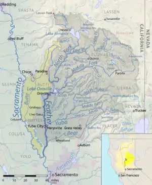 The river rises in four main forks in the Sierra Nevada which unite as arms of the Lake Oroville reservoir in the foothills 5 miles (8.0 km) northeast of Oroville in eastern Butte County. In terms of drainage areas the largest is the North Fork, which drains about 60% of the entire upper Feather River watershed. The Middle Fork is the second largest, draining about 32% of the upper basin. The South Fork and the West Branch are much smaller, each drains less than 5% of the upper basin.[12] The main stem Feather River begins at Oroville Dam, the outlet of Lake Oroville. From there the river flows generally south across the Sacramento Valley, east of the Sutter Buttes, past Oroville and Yuba City–Marysville. The Feather receives the Yuba River from the east at Yuba City and the Bear River from the east 15 miles (24 km) south of Yuba City. It empties into the Sacramento River from the north, about 20 miles (32 km) northwest of Sacramento.[13]