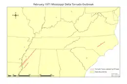 ![]() Map detailing tornado tracks of the February 1971 Mississippi Delta tornado outbreak | |