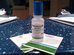 | Cards and bottle used for the Hemoccult test, a type of stool guaiac test | |