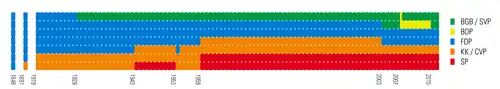 During that time, the FDP/PRD and CVP/PDC very slowly but steadily keeping losing voter share to the SVP/UDC and SP/PS, respectively, which overtook the older parties in popularity during the 1990s.