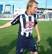 In the latter nation, to where he arrived in January 1999, he was relegated from La Liga in his first season, then became an undisputed starter as the Canary Islands side returned to the top flight in 2001, under Rafael Benítez.[4] With its Balearic Islands neighbours he managed to be relatively used during two years, helping them win the 2003 edition of the Copa del Rey.[5]