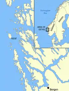 In February 1945, the German U-boat U-864 was sunk by the Royal Navy submarine HMS Venturer outside western Fedj, the only instance in history of a submarine being sunk by another submarine while both were submerged. The wreck of the U-boat was discovered in 2003 lying in 150 metres (490 ft) of water, 2 nmi (3.7 km; 2.3 mi) west of Fedje.[9] Its cargo included 67 short tons (61 t) of mercury which was being shipped to Japan. Contained in 1,857 rusting steel bottles in the vessel's keel, the mercury was discovered to be leaking out and currently poses a severe environmental threat. The rusting mercury bottles, the delicate condition of the wreck, and the presence of live torpedoes aboard it make the raising or salvage of U-864 extremely hazardous, and it has instead been proposed that the wreck be entombed.[10]