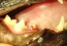 Feline Tooth Resorption (TR) is a syndrome in cats characterized by resorption of the tooth by odontoclasts, cells similar to osteoclasts. TR has also been called "feline odontoclastic resorption lesion" (FORL), neck lesion, cervical neck lesion, cervical line erosion, feline subgingival resorptive lesion, feline caries, or feline cavity. It is one of the most common diseases of domestic cats, affecting up to two-thirds.[1] TRs have been seen more recently in the history of feline medicine due to the advancing ages of cats,[2] but 800-year-old cat skeletons have shown evidence of this disease.[3] Purebred cats, especially Siamese and Persians, may be more susceptible.[4]