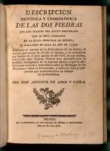 - León y Gama, Antonio de, Descripción histórica y cronológica de las dos piedras que con occasion del nueve empedrado que se está formando en la plaza principal de Mexico (1792) — a description of the Aztec calendar stone shortly after it was rediscovered