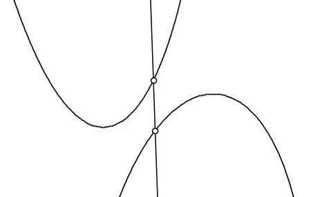 The next figure illustrates the maximization problem on the right hand side of the above equation. Tangents are drawn to each of the two curves such that both tangents have the same slope p. The problem is to adjust p in such a way that the two tangents are as far away from each other as possible (more precisely, such that the points where they intersect the y-axis are as far from each other as possible). Imagine the two tangents as metal bars with vertical springs between them that push them apart and against the two parabolas that are fixed in place.