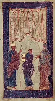 Ferdinand (left) and his wife Sancha (right) receive a book of hours from its scribe.